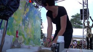 Live malen, zum Rythmus der Musik lasse ich mich spontan leiten und führen. Resonanz gibt den Ton an, der mein Gefühl auf meinen Pinselduktus überträgt. Acryl auf Leinwand 4 x 3 m – ein ganz besonderes Erlebnis!